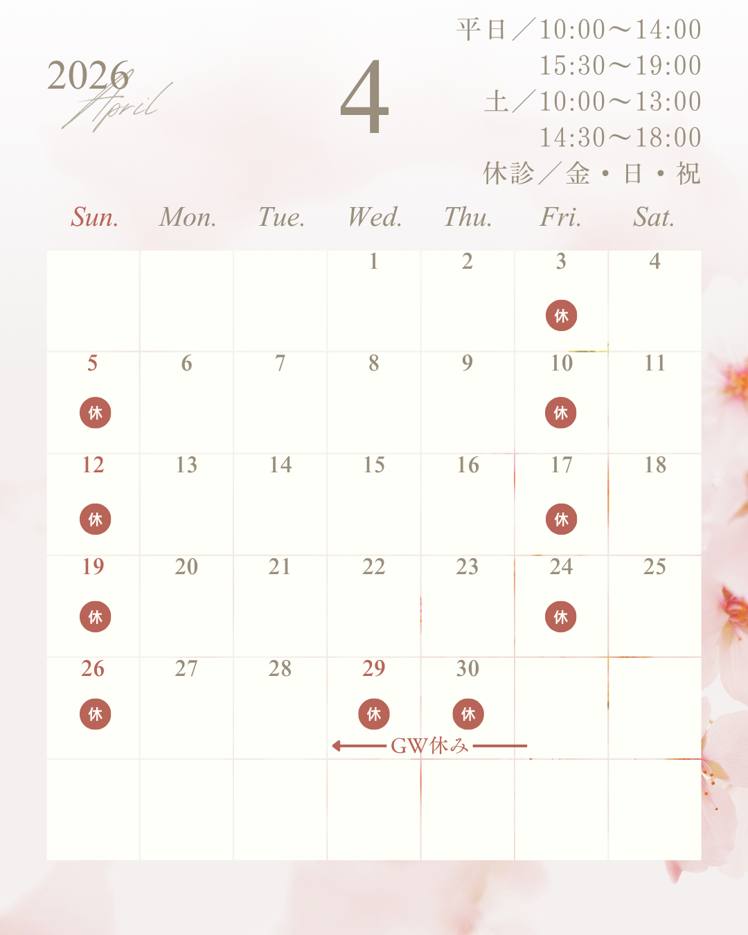 なお、5月はゴールデンウィーク期間中に休診日がございますので、事前にご確認ください。